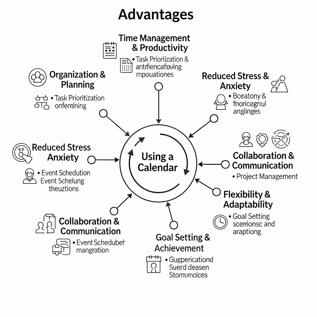 การใช้ปฏิทินช่วยให้สามารถวางแผนกิจกรรมล่วงหน้า จัดลำดับความสำคัญของงาน และบริหารเวลาได้อย่างมีประสิทธิภาพมากขึ้น